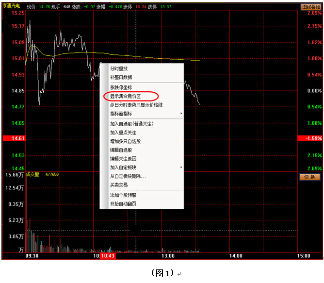 众所周知,股票每天的收盘价是通过多空双方经过全天博弈而最后产生的结果。但股票的开盘价有时高开有时低开,这又是由谁来确定的呢?其实在每天开盘之前,多空双方就已经进行了一次相互较量,这就是集合竞价过程,该过程的时间不长,只有十分钟,时间段为9:15至9:25,若股票被很多人看好,那么大家在集合竞价的时候可能就会为了能及时买到股票而相互抬高买入价格,于是股票就很可能出现高开;反之,若出现利空,大家都急于卖出股票,就会在集合竞价的时候相互给出更低的卖价,股票因此也就会低开。所以看清集合竞价,对于把握市场中投资者的心态,具有很好的帮助。那么如何查看集合竞价阶段的价格变化呢?如图1所示,在个股分时图上点击鼠标右键,将会弹出一个操作菜单,然后在弹出的菜单中找到并用鼠标左键点击“显示集合竞价变化”,之后集合竞价过程的价格变化图就会显示出来,见图2: