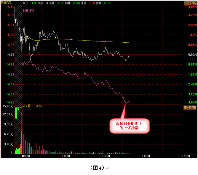 我们常说:“做股票要做强势品种”。那么什么是强势品种?一个简单的判断标准就是“强于大盘”。那么如何在分时图上看出手中的股票是强于大盘还是弱于大盘呢?若是将大盘的分时图和个股的分时图放在一起是不是就很好比较了?于是我们想到了在个股分时图上叠加大盘的分时图,操作方法如图3所示,先在个股分时图的左下角找到“指数叠加”并点击,然后在弹出的菜单中根据个股所属市场的不同选择相应的指数进行叠加,比如图3中的个股是亨通光电,是沪市的股票,那么我们就点击“上证指数”来进行叠加,叠加后的效果见图4: