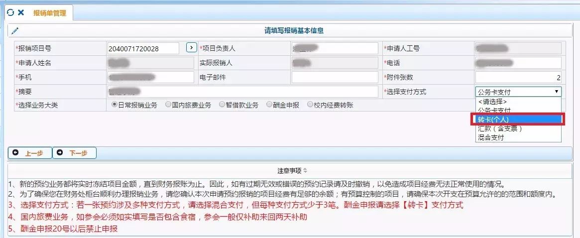 (1)张老师填入基本信息后,业务大类选择了“国内旅费业务”,支付方式选择了“转卡(个人)”,并点击下一步。